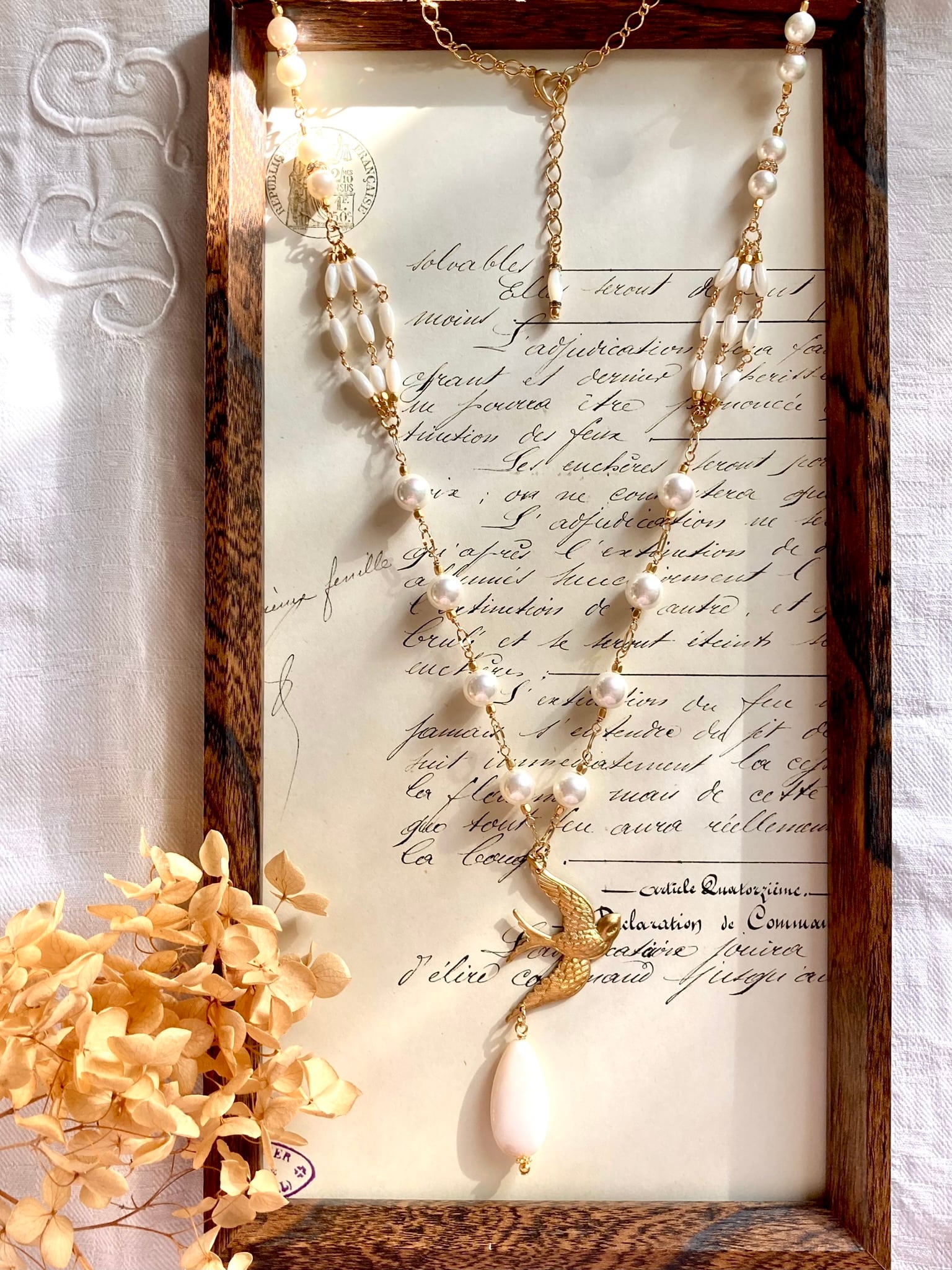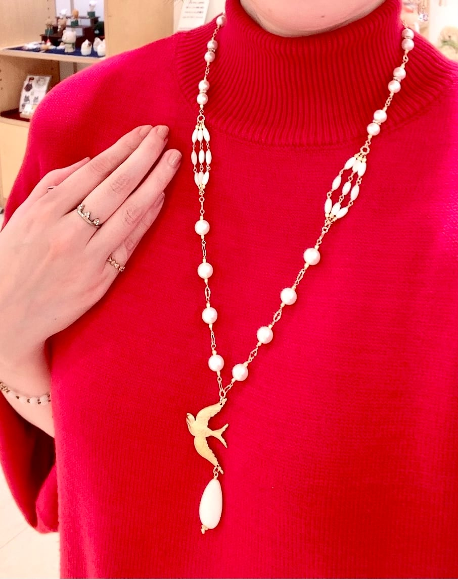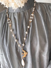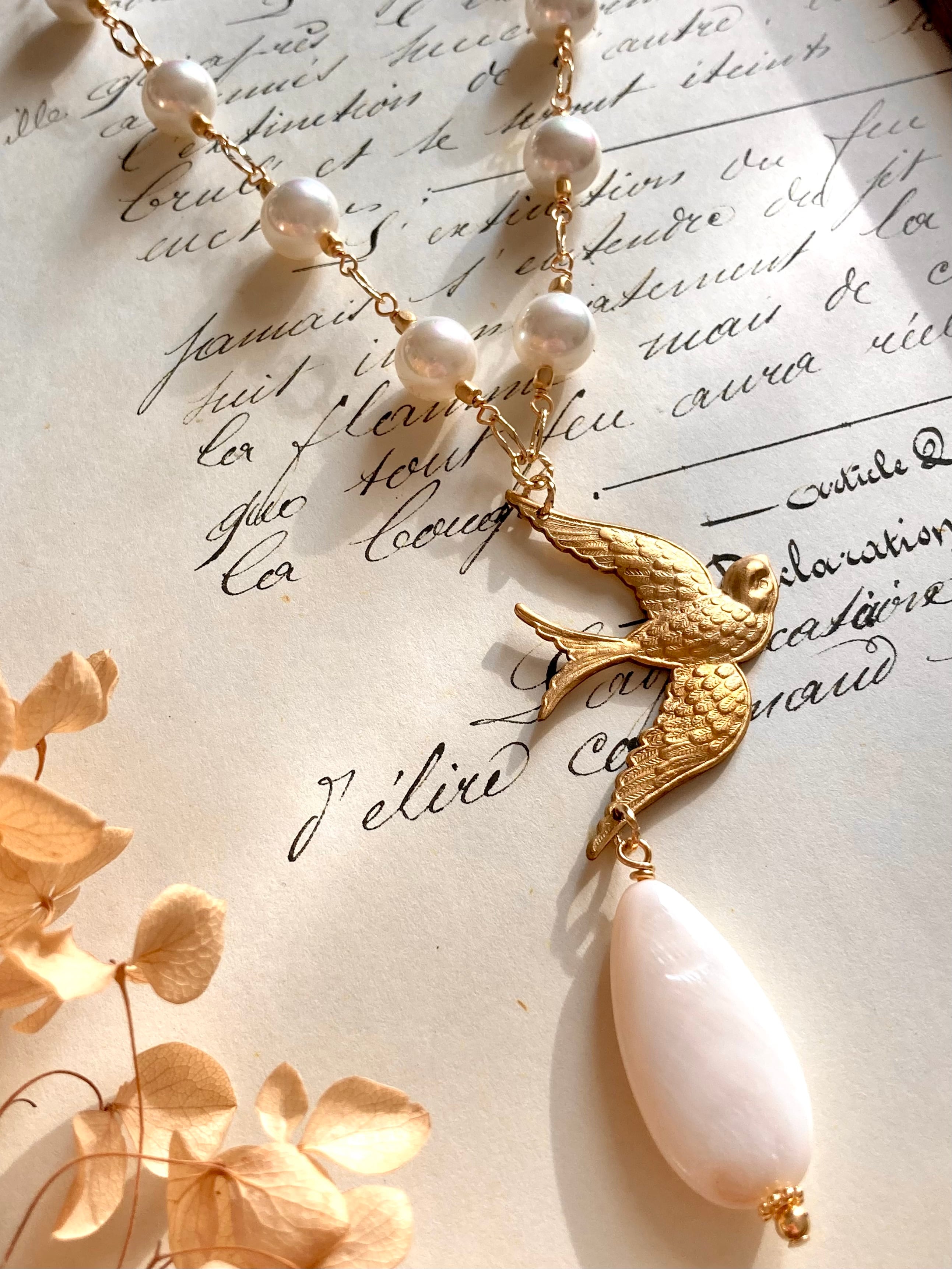 マザーオブパール/天然貝パーツ/真鍮製鳥チャーム/ラインストーン/金メッキ金具